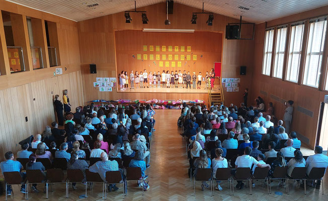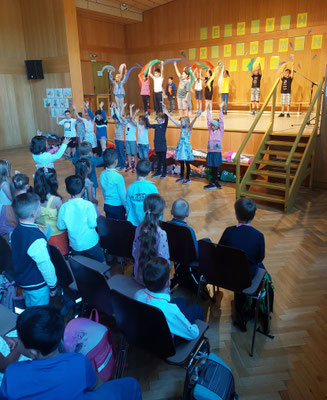 dass sie sich mit ihnen über den Schulstart freuen. Zur fröhlichen Feierlaune trugen die musikalischen Beiträge „Alle Kinder lernen lesen“ der Klasse 2a und das englische Lied „If you´re happy