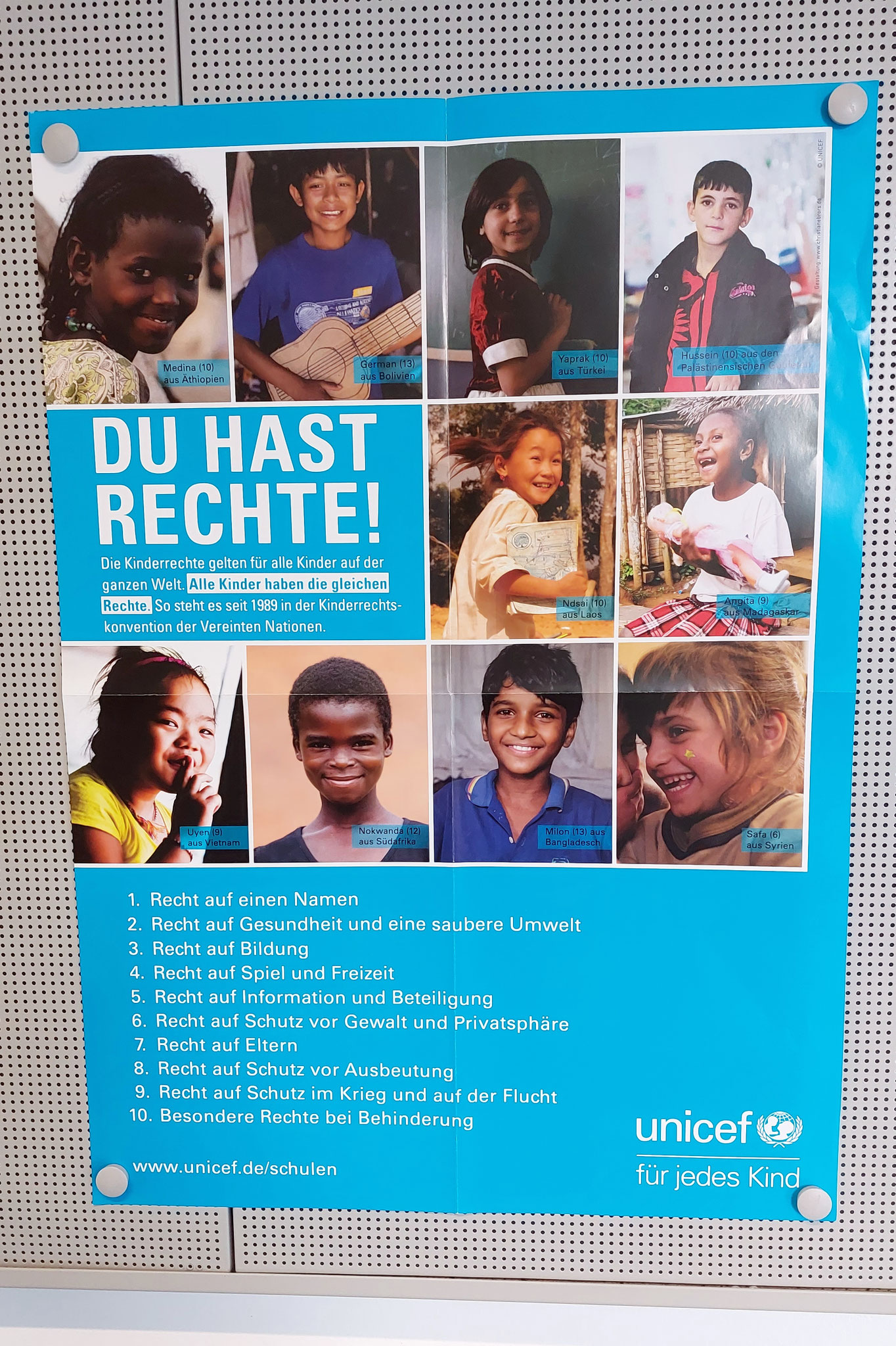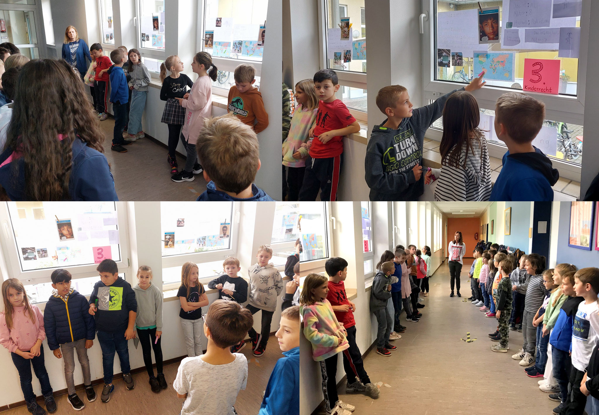 „Mitmach-Museumsrundgang“ aller Klassen durch das gesamte Schulgebäude an. Vor und hinter jeder Klassenraumtür wurde an diesem Vormittag auf eines der zehn wichtigsten Kinderrechte aufmerksam