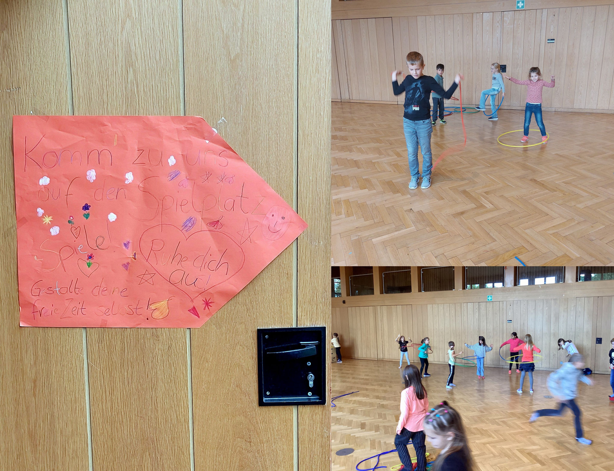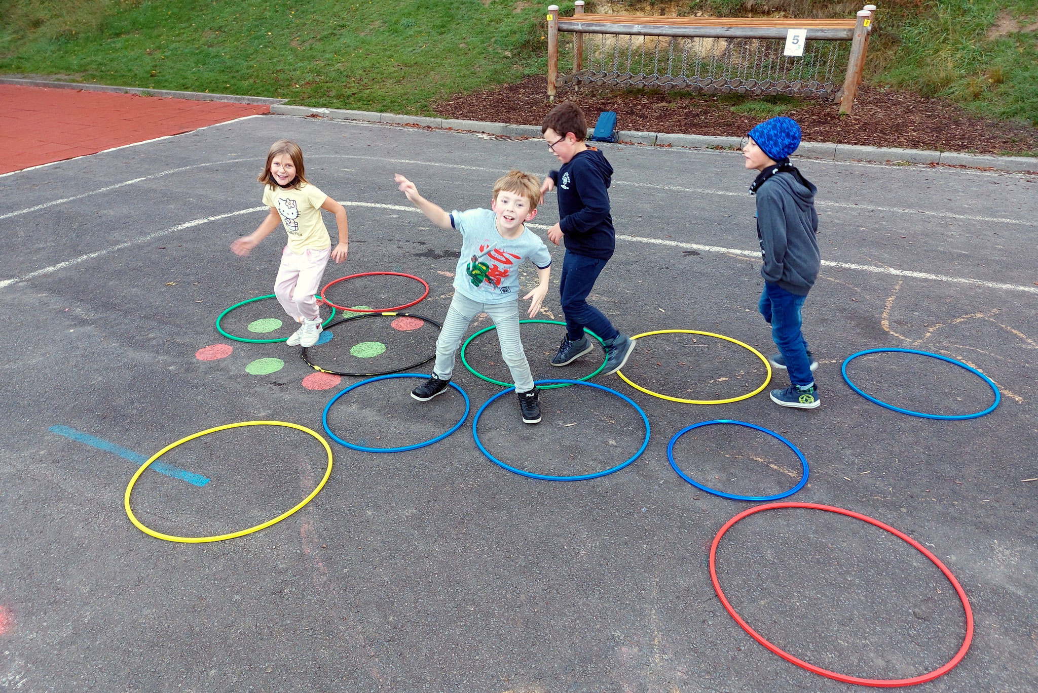 Würfelglück gefragt waren: Nach einem Würfelwurf liefen die Kinder so schnell sie konnten zu einem mit Reifen gelegten Spielfeld, auf dem sie das Hütchen der Klasse um die gewürfelte Augenzahl