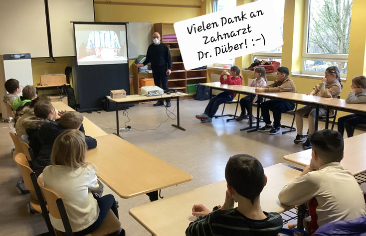 Am Montag, 20.03.2023 und Dienstag, 21.03.2023 besuchte Zahnarzt Dr. Düber die Grundschule Selters. Er erklärte uns, wie die einzelnen Teile eines Zahnes heißen, wie wir unsere Zähne vor Karies schützen und wie wir unsere Zähne richtig putzen. – Wir putzen nach der KAI- Methode: Kaufläche- Außenfläche und Innenfläche. Gesunde Zähne brauchen: regelmäßige Besuche beim Zahnarzt, wenig Zucker essen, Zahnpasta mit Fluorid und täglich Zähne putzen. Jedes Kind bekam zum Abschluss des Zahnarztbesuches eine Zahnbürste geschenkt. Vielen Dank, dass Sie bei uns waren, Dr. Düber! (Es berichtete die kath. Religionsgruppe der Klassenstufen 3 und 4.)